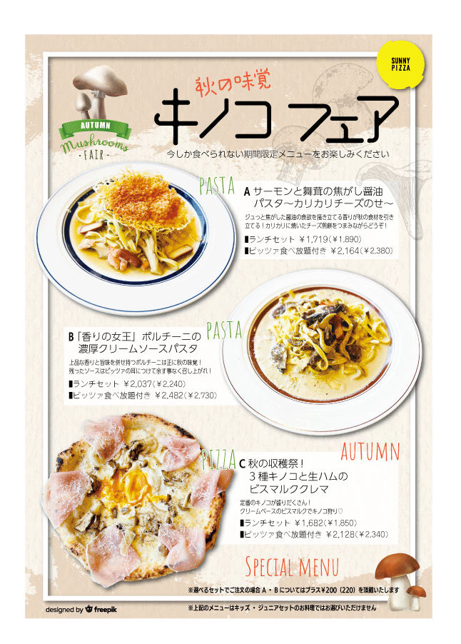 秋の味覚、きのこフェア 2024 10/18 サニーピッツァ 2024-09-182024-10-18 今しか食べられないメニューをお楽しみください! サニーピッツァ よかったらシェアしてね! URLをコピーしました! URLをコピーしました! 夏のシュラスコパーティー🍖 期間限定🍁ランチメニュー♪ 関連記事 爽やかで甘酸っぱい♪おすすめ♪SWEET PIZZA 2024-06-26 父の日限定!! 2024-06-14
