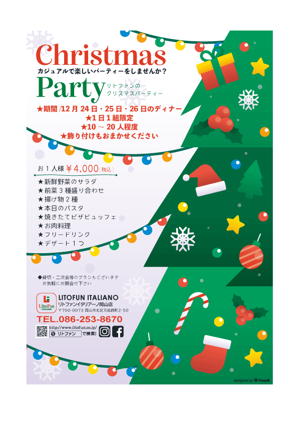 岡山店の✵クリスマスパーティー✵ 2025 1/15 リトファン 岡山店 2024-11-042025-01-15 リトファン 岡山店 よかったらシェアしてね! URLをコピーしました! URLをコピーしました! 秋のおすすめパスタ♪ 津山店🎅X’masメニュー🎄 関連記事 ⛄冬のおすすめピッツァ⛄ 2024-12-15 津山店🎅X’masメニュー🎄 2024-11-20 🍁秋のおすすめピッツァ🍁 2024-09-18 期間限定🍁ランチメニュー♪ 2024-09-18 newランチパスタ 2024-01-24