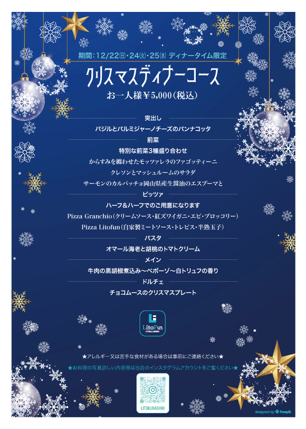 倉敷店🎄Christmas menu🎄 2025 1/15 倉敷店 2024-11-202025-01-15 倉敷店 よかったらシェアしてね! URLをコピーしました! URLをコピーしました! 津山店🎅X’masメニュー🎄 ⛄冬のおすすめピッツァ⛄ 関連記事 秋のおすすめパスタ♪ 2024-09-18 夏のシュラスコパーティー🍖 2024-07-16
